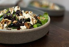 Салат с черносливом, вяленой свеклой, сезонной зеленью, сыром и грецким орехом с медовой заправкой