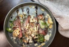 Тёплый салат из томлёной в вине куриной печени, с помидором черри, сезонной зеленью и бальзамической заправкой