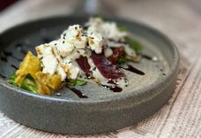 Салат с вяленой уткой, сезонной зеленью, вялеными томатами, творожным сыром и апельсиново-горчичной заправкой